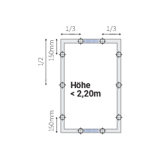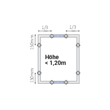 = Magnete: Der Sperrbereich in der Mitte des Rahmens variiert aufgrund der angegebenen Sprossenhöhe, um +-100 mm.